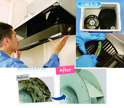日ごろのお手入れではなかなか手の出せないフィルターやファンのしつこい油汚れはプロにおまかせください!分解洗浄で、クリーニング後は換気効率が格段にアップします。