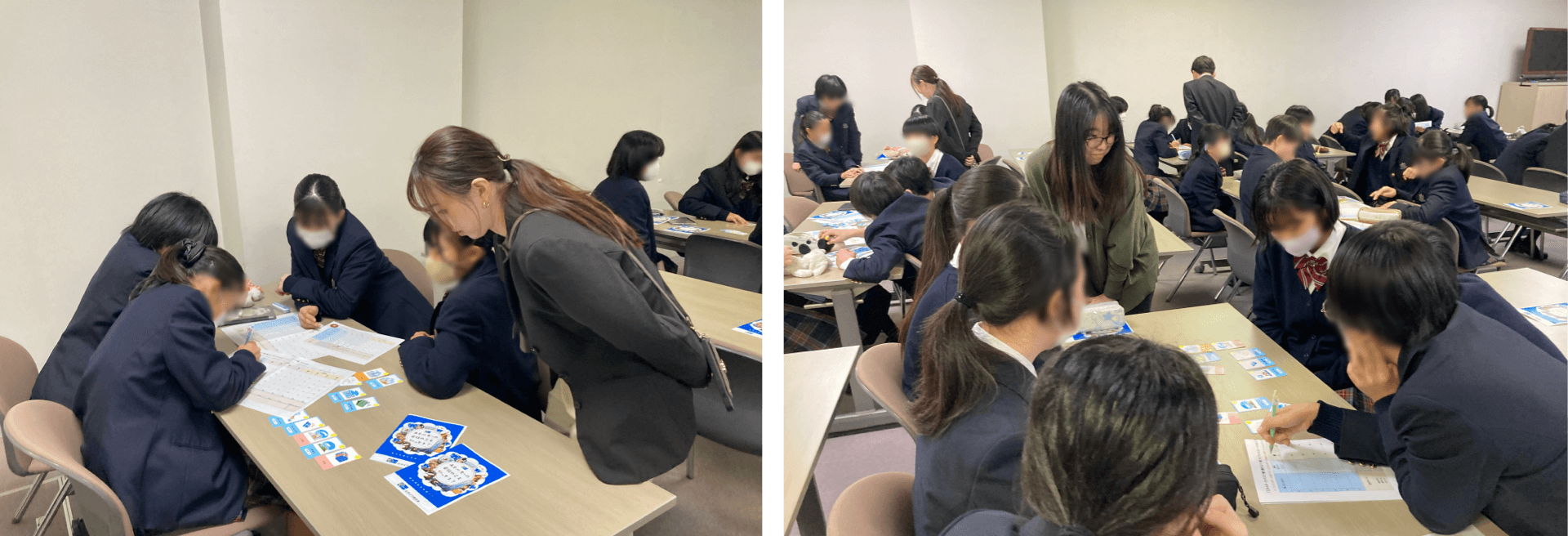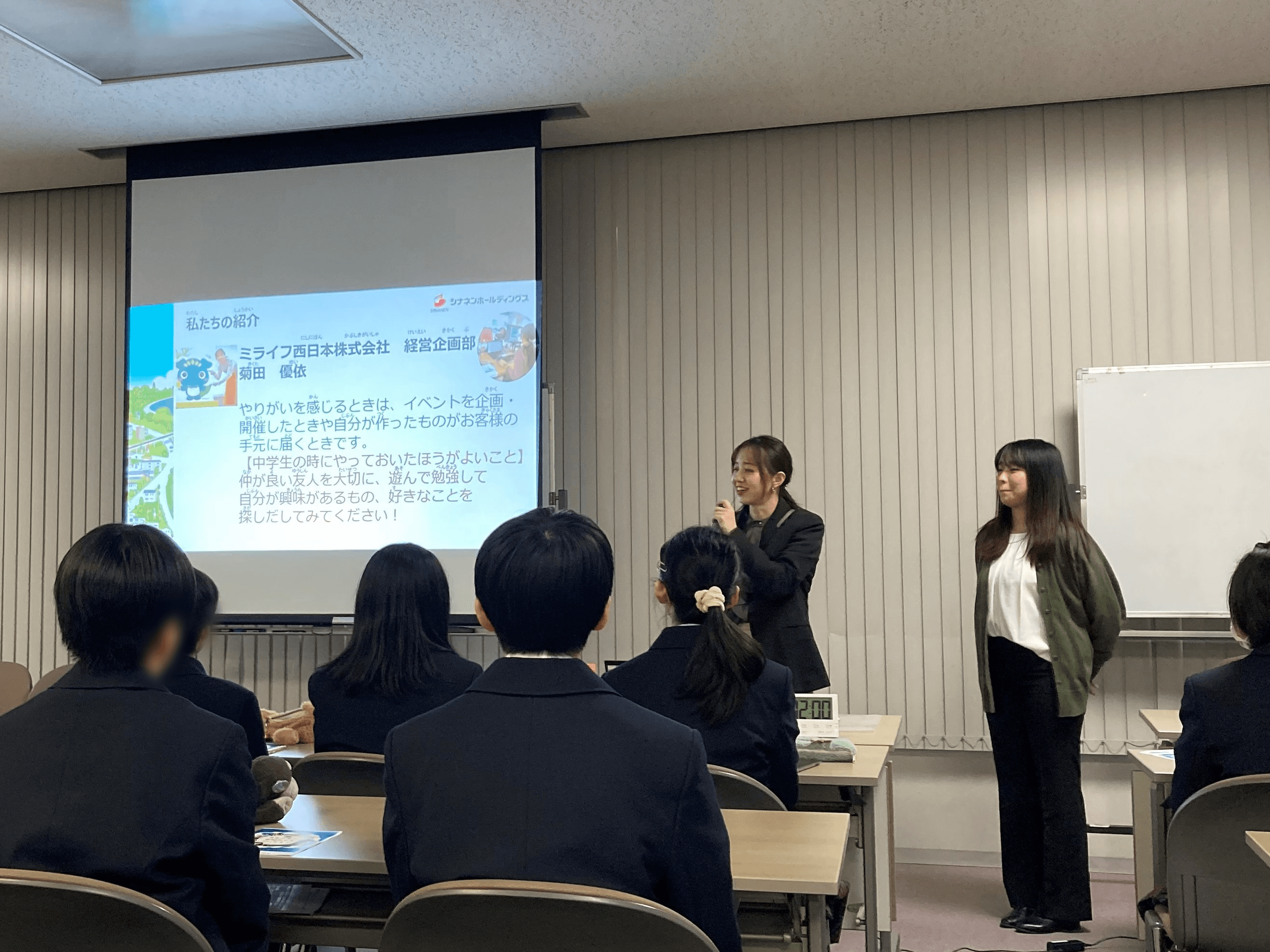 冒頭、ミライフ西日本の広報担当の女性社員2名より、これから将来のキャリアプランを考えていく生徒の皆さんへ、仕事のやりがいや中学生の時にやっておいた方が良いことをお話しました。日頃あまり接点の無い社会人女性の話に、多くの生徒が真剣に聞き入っていました。