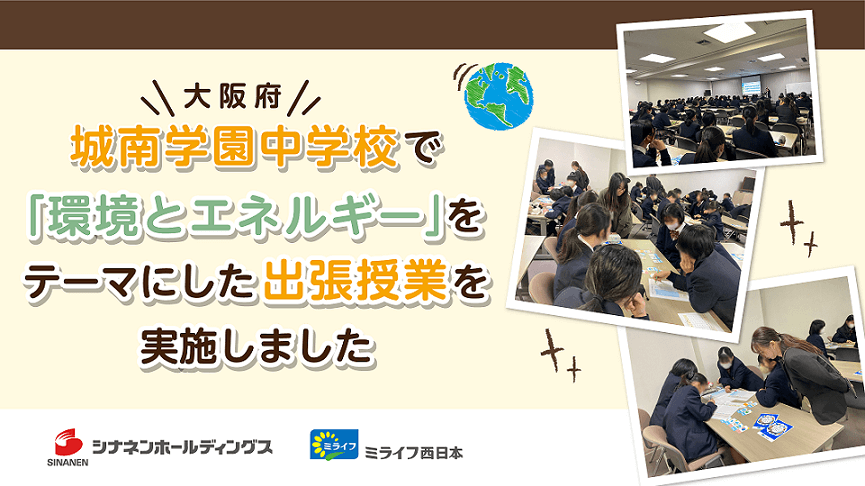 シナネンホールディングスおよびミライフ西日本は、12月13日(水)に、大阪府大阪市の城南学園中学校にて、1~3年生の生徒約80名を対象に、「環境とエネルギー」をテーマにした出張授業を実施しました。